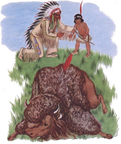 And it hit the buffalo. And the buffalo was dead. "Ah!" said Little Thunder, "at last I shall have buffalo for dinner." Little Thunder took the buffalo home. |