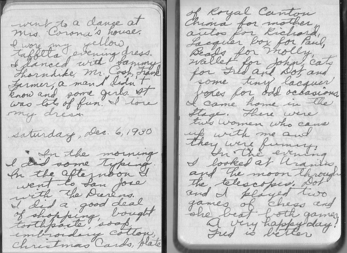 Carol Burrowes DeWolf's Diary - October 15 to December 30 1930 on Mount Hamilton - Page 34 1 2 3 4 5 6 7 8 9 10 11 12 13 14 15 16 17 18 19 20 21 22 23 24 25 26 27 28 29 30 31 32 33 34 35 36 37 38 39 40 41 42 43 44 45 46 47 48 49 50 small large |